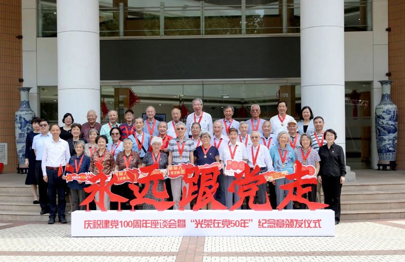图片说明:2021年6月22日,学校举行庆祝中国共产党成立100周年座谈会暨“光荣在党50年”纪念章颁发仪式